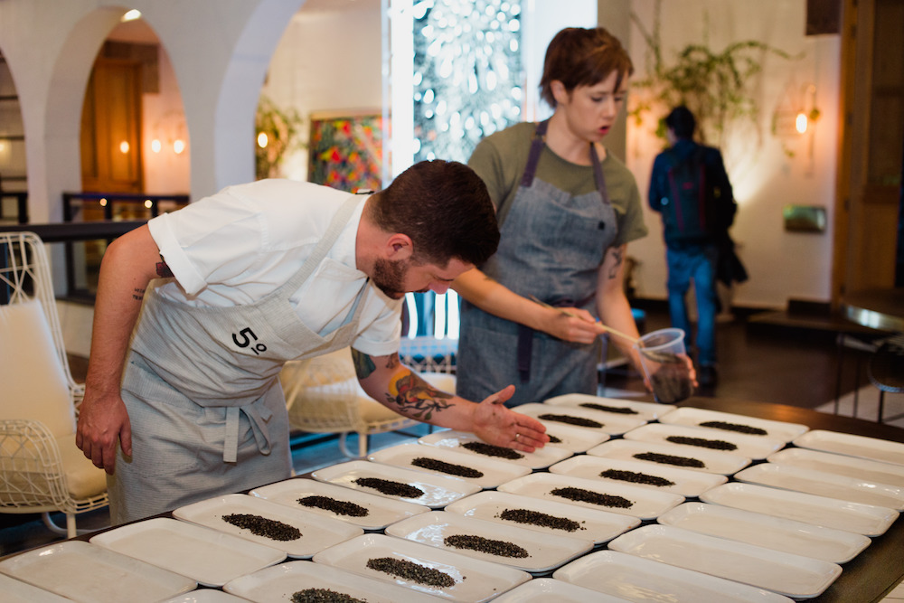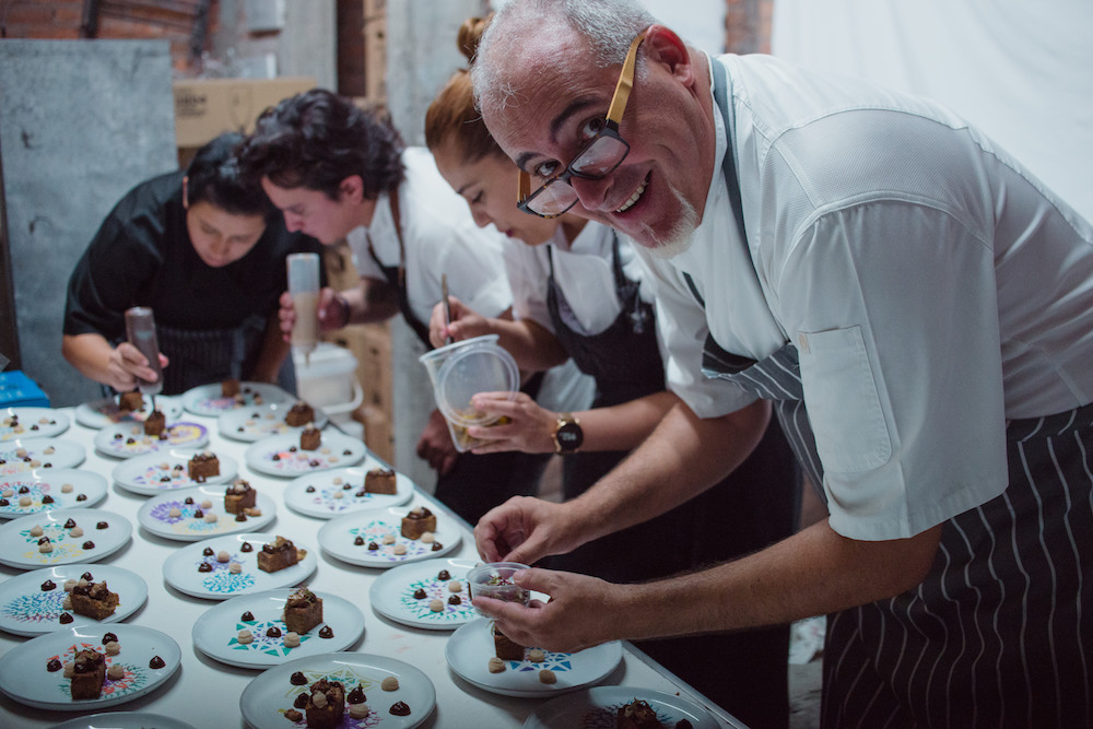 During this event, the Mexican artist Arantza X Rodríguez was invited to intervene the dinner tablecloths where she painted different colored fractals (geometrical figures that are repeated in different scales) with which she sought to transmit a spiritual message. Arantxa intervened the plate of the second time, which served to iron the duck confit, this work was a collaboration with Chef Patrick Cros and used vegetable shortening as an essential element.