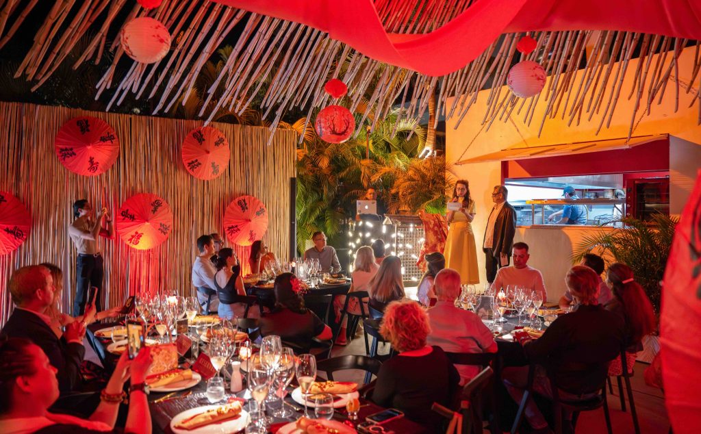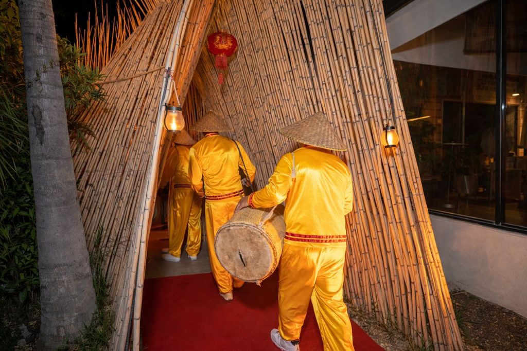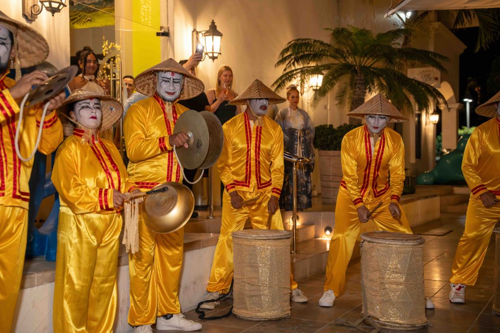 From the moment guests arrived, the atmosphere was immersive. On the terrace, beneath glowing lanterns, signature cocktails welcomed attendees as they paused for photographs before the evening’s first surprise emerged. In a dramatic spectacle, a ceremonial Chinese Dragon ignited the night, guiding guests across a red carpet framed by vintage Bruce Lee film reels. The theatrical entrance signaled the beginning of a carefully curated journey through memory, movement, and meaning.